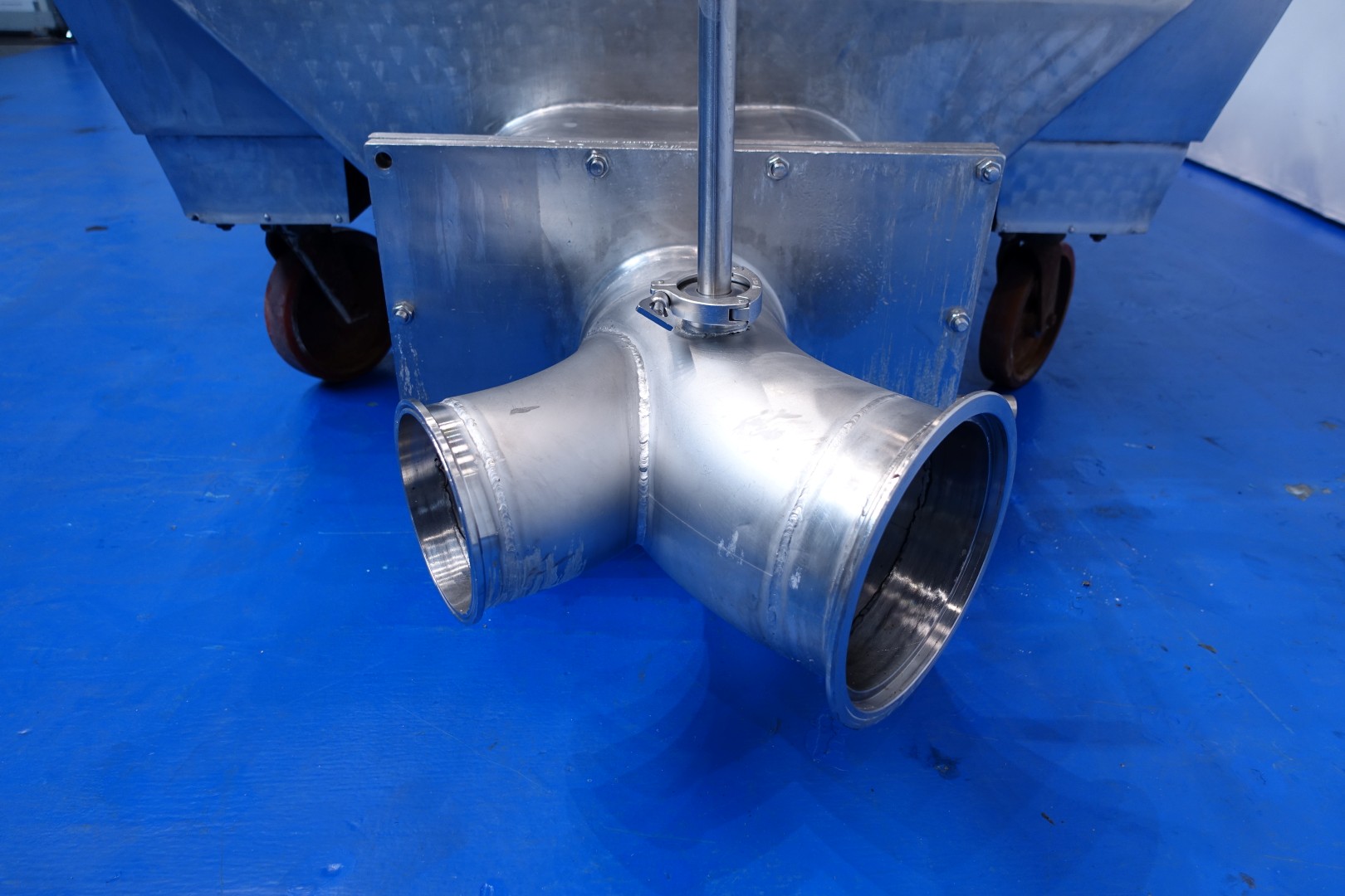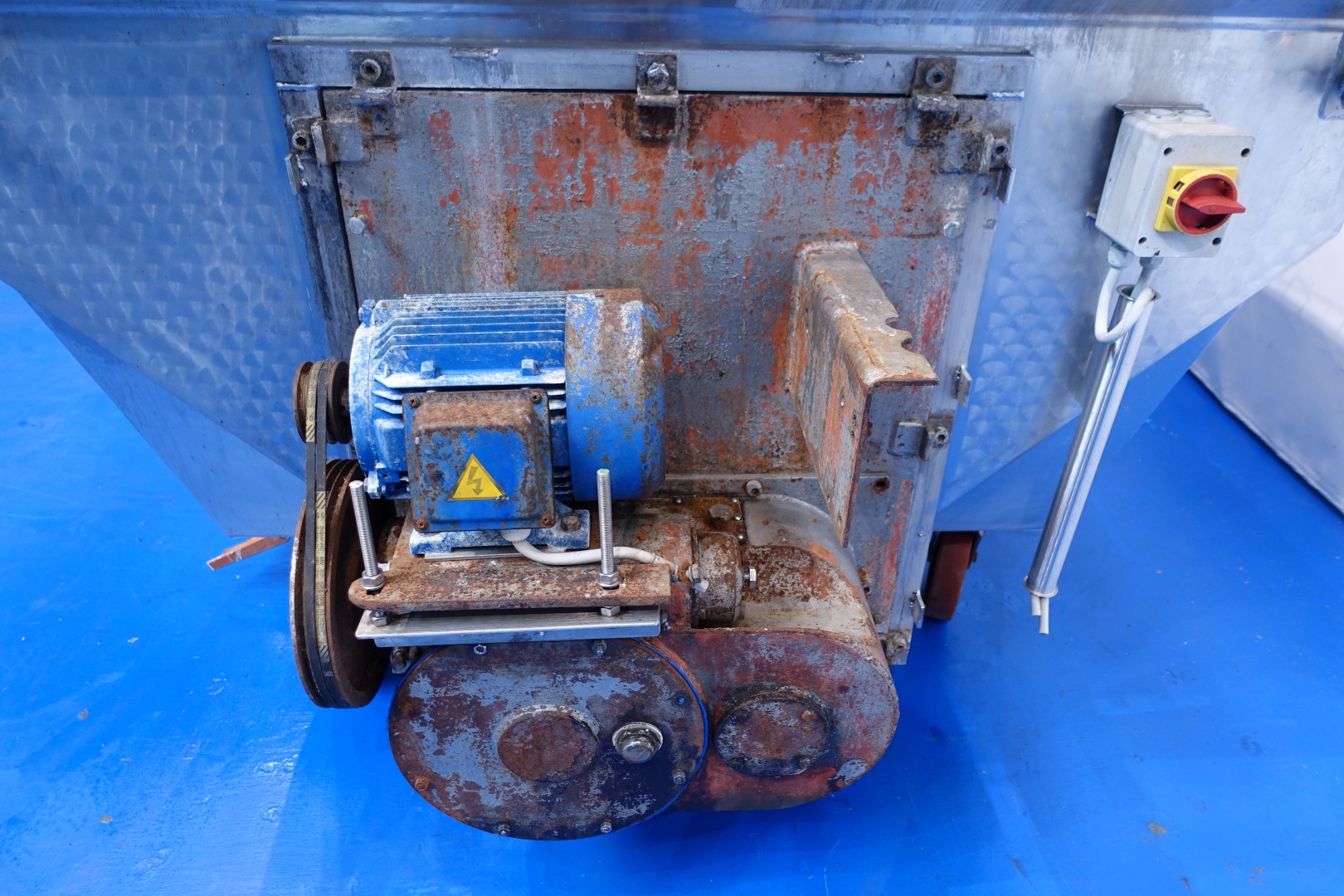 Mobile open butter silo with covers. 2 Augers with 1 motor. Length of the augers 265 cm. Motor power: 2,2 kW - 5,2 A - 950 rpm - 50 Hz. One cover on each side which can be opened. CIP cleanable by 2 spray bowls in tank and 1 at outfeed augers. 2 x round Flange connections for butter pumps 1x Ø 165 mm and 1 x Ø245 mm. Total outside dimensions: 340x184x195 (lxwxh) cm, weight: 1.050 kg.