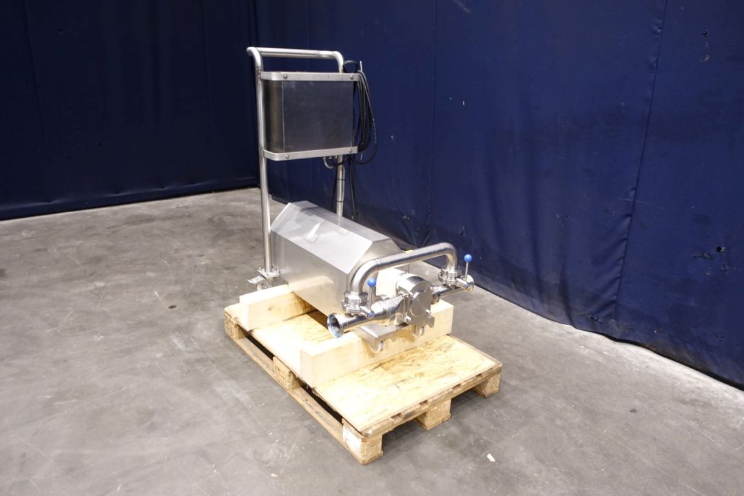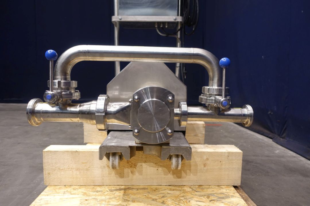 Lobbe pump with tri stainless steel lobbes. Diameter lobbes: 80 mm. Current drive work: motor: 1,5 kW - 3,51 A - n1: 1.440 rpm - i= 7,2 - n2: 158 rpm. Variable speed by Mitsubishi D700-SC frequency converter in panel direct on frame. Stainless steel cover over electric motor. By-pass pipe for cleaning with two manual butterfly valves. Mounted on mobile SS frame with handle bar. Connections: (in) 3" Din / (out) 2,5" DIN. Elsto transmission type C322P P90. Weigth 170 kg.