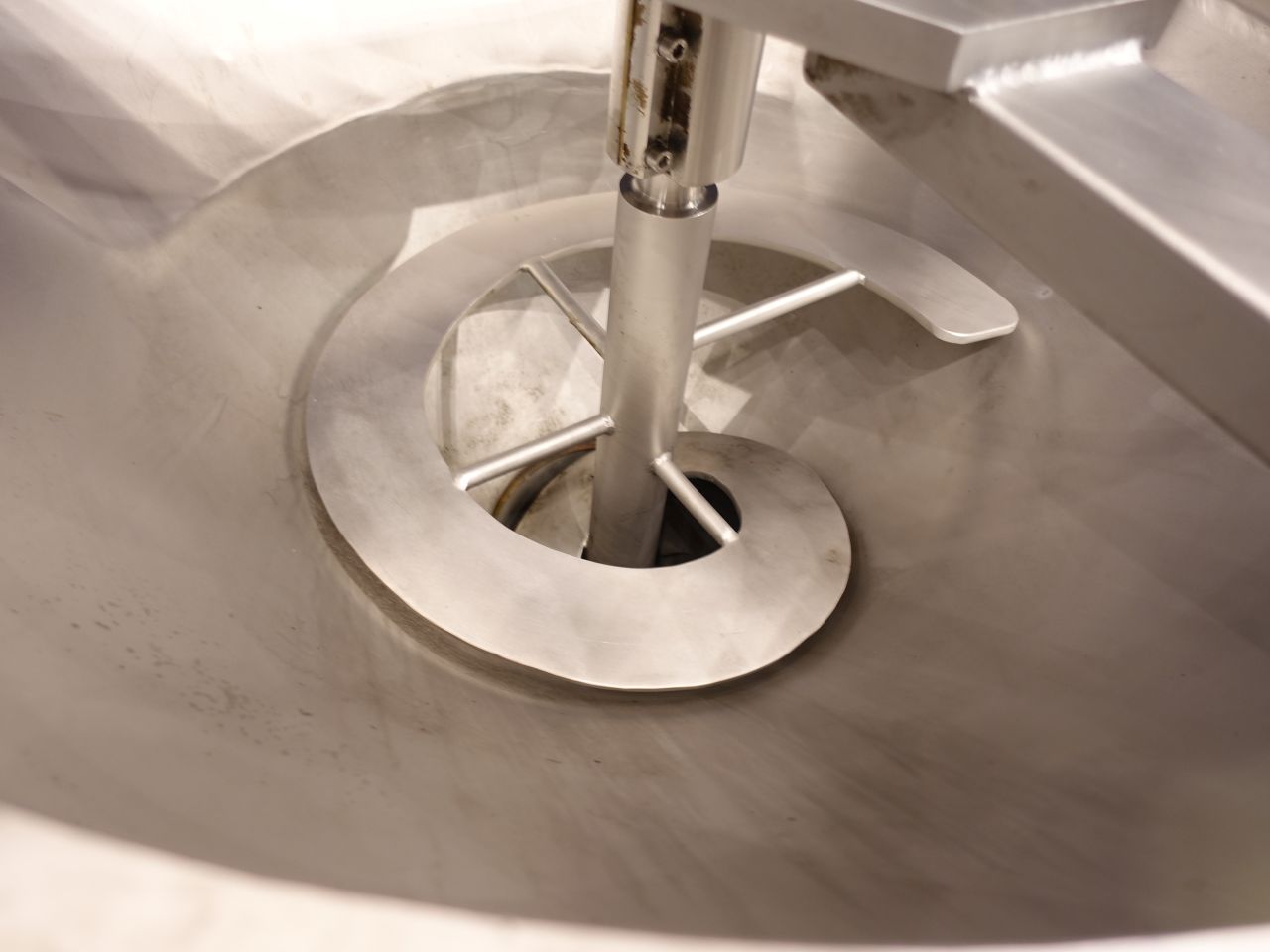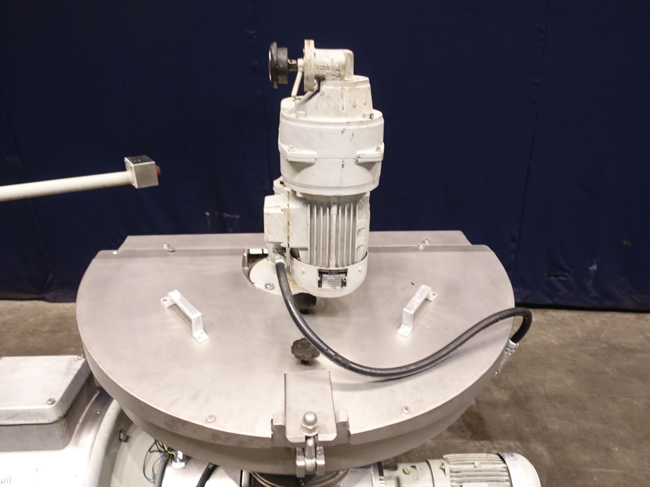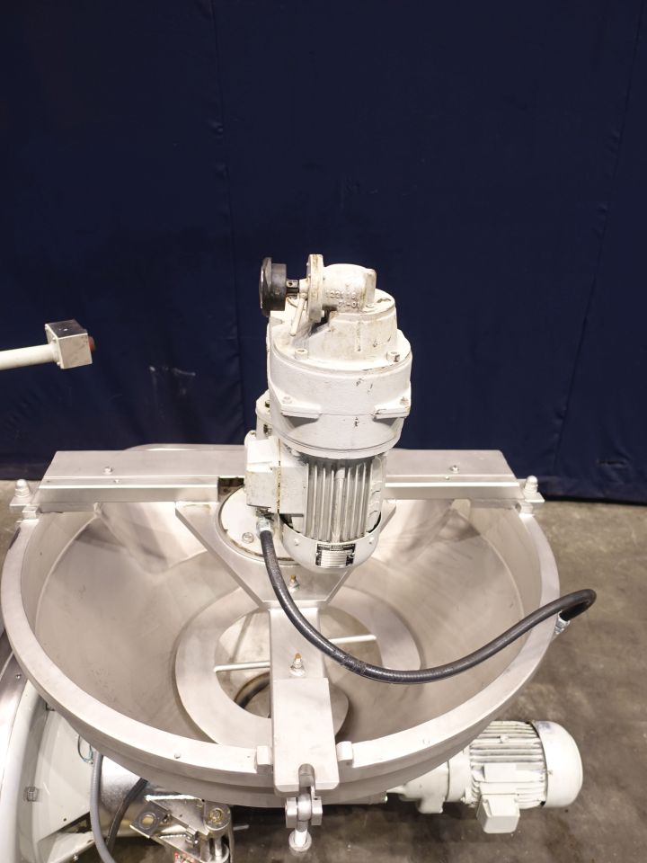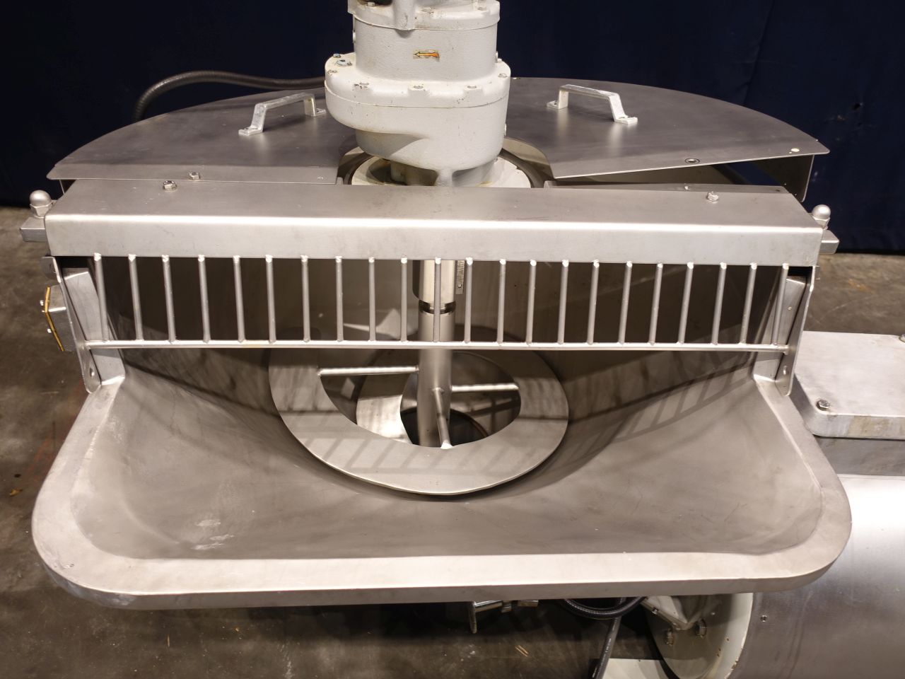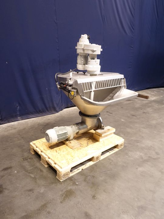 Inlet hopper with top driven vertical stainless steel infeed screw agitator (variable drive, Motor 1,1 kW) and horizontal infeed screw (Motor 1,1 kW) to a Stephan Microcut MCH60 machine, for push in viscose products to the Microcut like Amandel or other viscous products. Total dimensions: 120 x 110 x 150 cm.