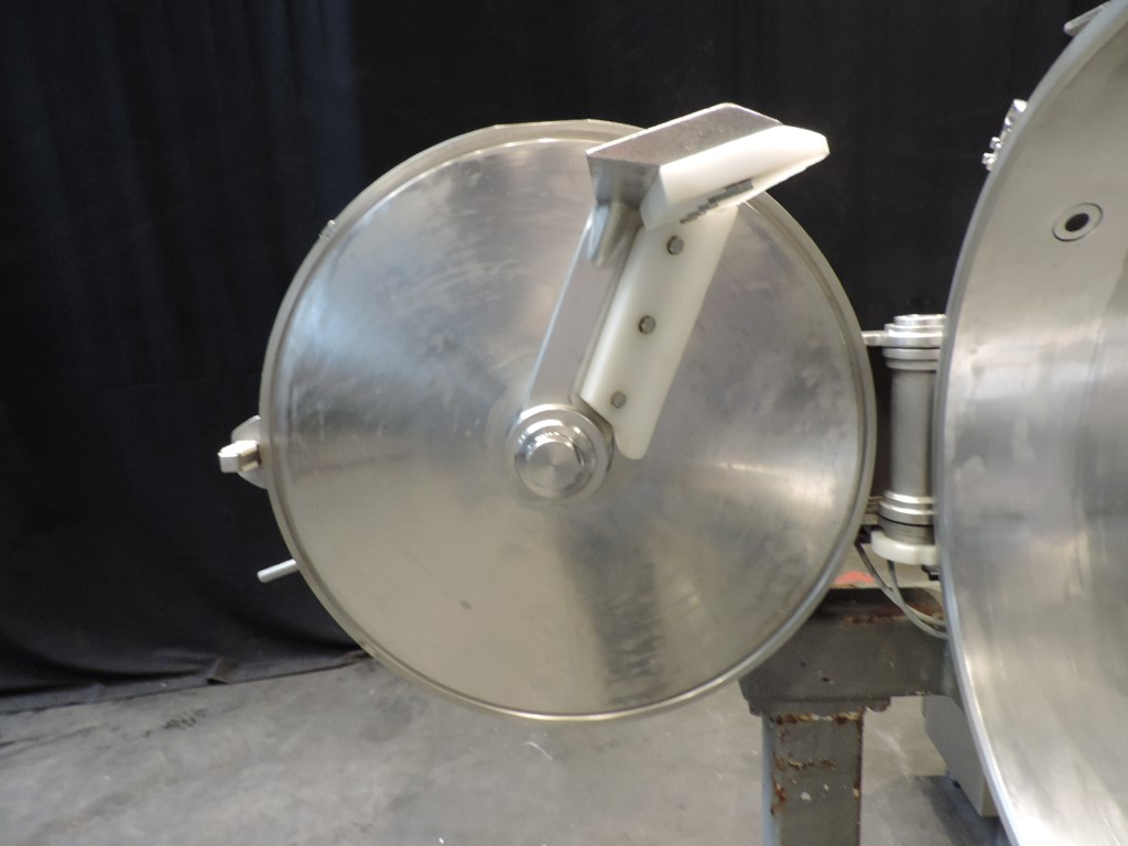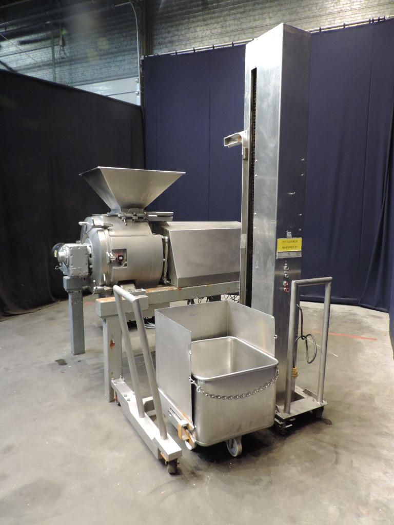 Universal horizontal mixer-cooker. The main product bowl and cover are double jacketed for cooling or heating (no valves on jacket), no vacuum. Hydraulic unit for moving inlet slide and outlet slide on bottom. Top inlet and the main front lid have 2 manual tightening clamps and contact sensor, infeed hopper. 2 agitators: 1 scraper agitator, 25 rpm and 1 mixer knife, motor 22 kW - 710 rpm. Total electrics: 27 kW - 60 A - 380 V -50 Hz. steel frame. Including elevator for trolleys 200ltr with controls cabinets on elevator and machine. Documentation available. Outside dimensions: 2,5 x 4,25 x 3,25 meter. Total weight: 1960 kg.