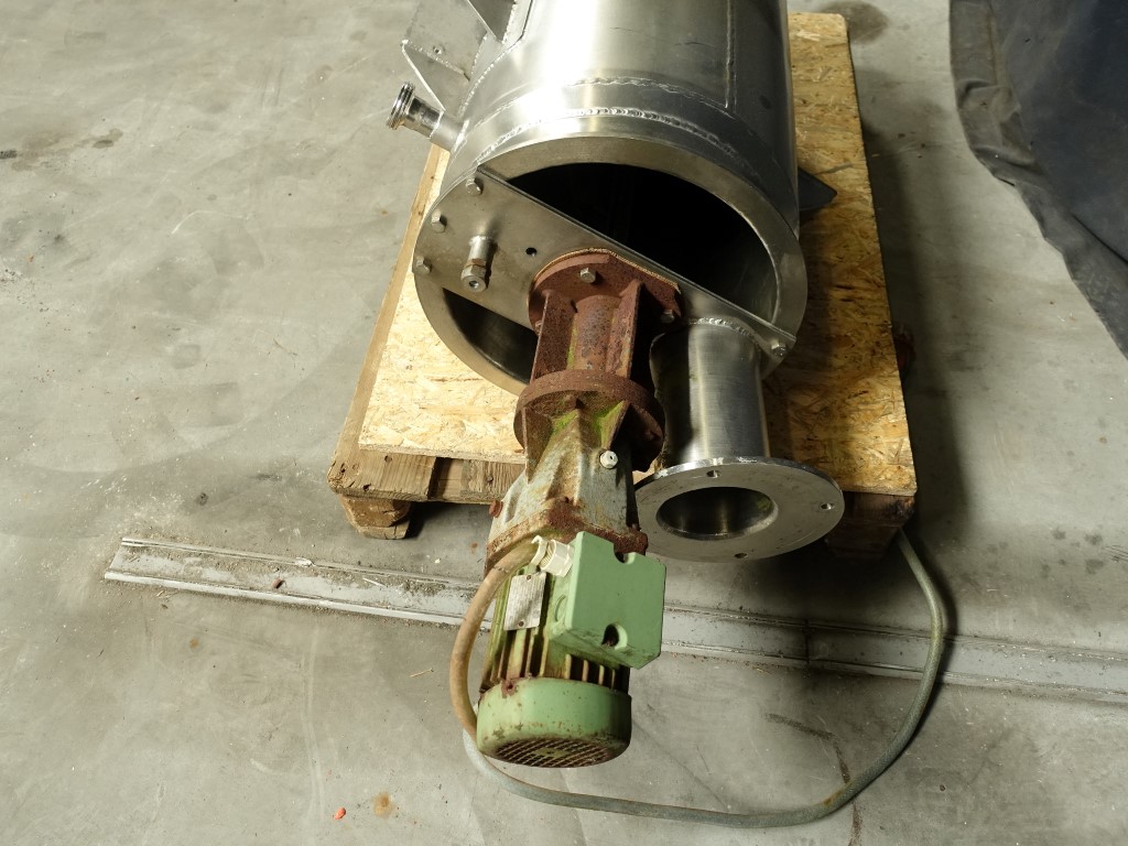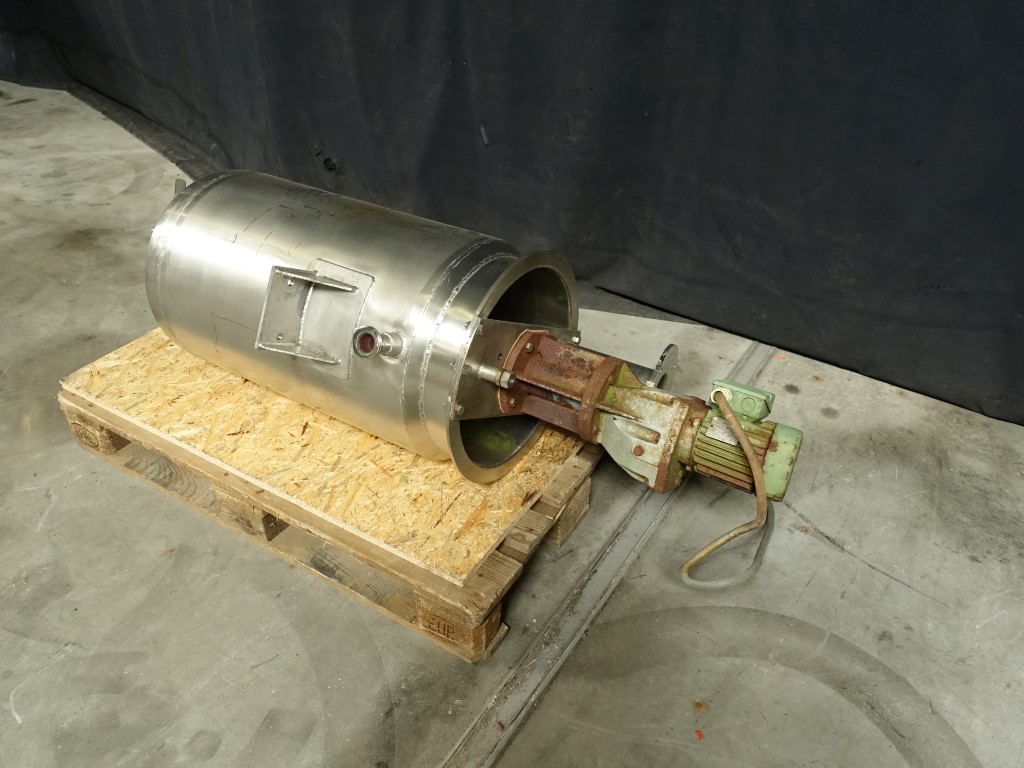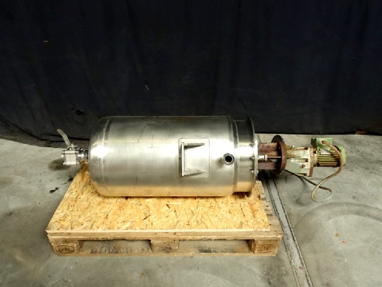 Top driven U shaped agitator, 0,37 KW n1 1345rpm, pressure in jacket: ± 3 bars, pressure in tank atmospherique. Conical botom, Product Outlet 2'', with manual ball valve, innner dimensions of tank diameter 39 cm height 80 cm outer dimensions lxwxh: 70 x 50 x 140 cm.