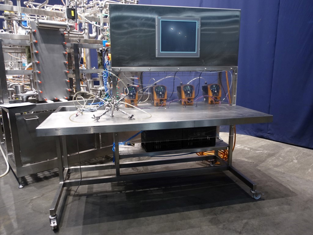 Pilot plant line 2 stage UF plant used for the NDC process. Incoming raw material: Milk, MCI 80, cream etc. Line existing out of : 1) Skid mounted pretreatment pasteurisation unit, 200 ltr/h @ 70/100°C (Fristam FZ15 self-priming pump for emptying feed IBC tank, 1.000 ltr/h, balance tank, BamInox, 50 ltr, Jung Hyghspin double screw product feed pump of 200 ltr/h @ 4 bar, GEA Ecoflex VT04 plate heat exchanger with 6 sections, temperature cycles adjustable: in 5°C - 50/55° - 70/100°C - various holding tubes in insulated box 10/15/30''- 68/98°C - 50/55°C - 6°C, indirect hotwater system with steam, cooling with city and icewater, 2 Grundfos centrifugal waterpumps, unit has its own control panel with frequency convertors, Siemens S7 PLC and Siemens touch screen, dimensions: 140 x 220 x 280 cm). 2) Dosing unit with 4 dosing pumps mounted on a mobile frame with table (Prominent Delta, 1608NPE, dosing rate of each pump: 7,8 l/h, 16 bar, unit has its own control panel with Siemens S7 PLC and Siemens touch screen, dimensions: 140 x 220 x 220 cm). 3) Ultrafiltration unit with an outfeed of 3-40 ltr/h, 2 stages (balance tank 500 ltr with agitator, feed pump of 960 ltr/h @ 4 bar, plate heat exchanger, preheater with 2 sections, 5°C - 60 °C, UF1, PF plate and frame filter system with plate filter, CONSEP Filter Module, Membrane Type: 10kda PES, max 20 m2, Jung Hyghspin 90 twin/double screw circulation pump 49 m3/h @ 10 bar, UF2, plate and frame filter, CONSEP Filter Module, Membrane Type: 10kda PES, max 10 m2, UF1 and UF2 could run each only or in series, Jung Hyghspin 90 double /twin screw pump 32 m3/h @ 8 bar, 2 Alfa Laval centrifugal pumps, Grundfos centrifugal pump, Lobbe pump, 3 tubular heat exchangers in which 2 for product and 1 for water, unit has its own control panel with Siemens S7 PLC and Siemens touch screen, dimensions: 480 x 220 x 280 cm). Flowschemes and electric schemes of the line available.