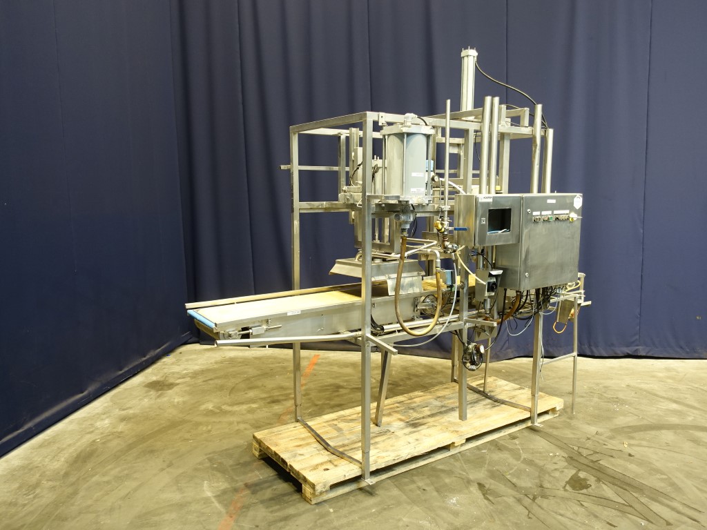 Cheese mould outblow device. Mould size ±38 x 38 cm. Infeed of the mould without lid upside down. First step cheese outblow of the mould. Second step lifting of the mould from the cheese (2 lifting steps to conveyor). Third step push of mould to conveyor (conveyor excluded). Mould outgoing on higher rolling conveyor (excluded), cheese outfeed on belt conveyor. Total dimensions: 3,4 x 1,4 x 2,9 mtr.
