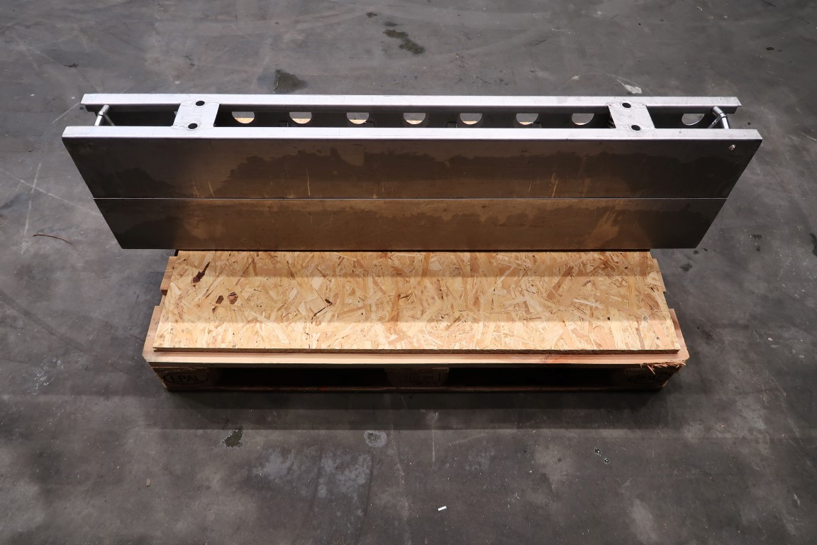 Compressable End press plate of a Pre-press/draining vessel. Diameter of the holes: 32 mm. Distance between the holes: 85 cm. Total dimensions: 139,7 x 15,7 x 33,7 cm. To be placed at the of the curd bed to be able to make the pressing bed longer or shorter.