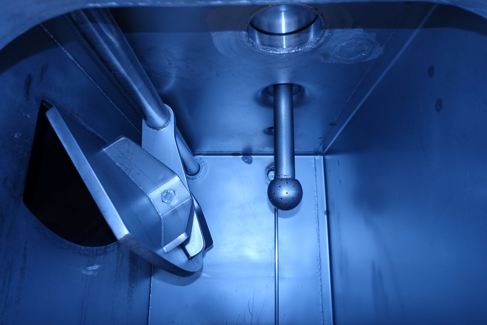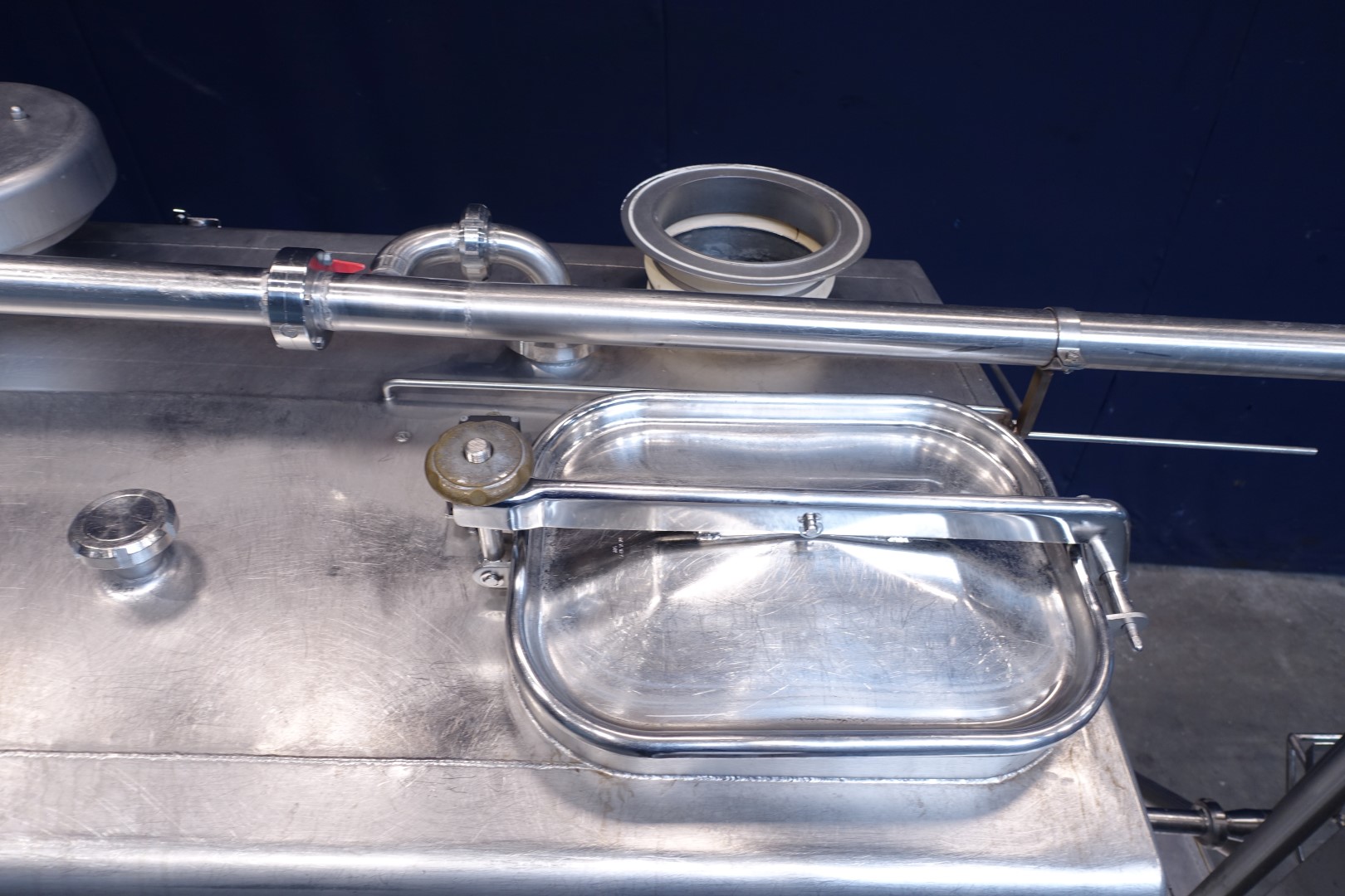 Stainless steel (SS304) ribbon blender (single shaft), previously used for mixing of cheeses in preparation of processed cheese. Main motor for driving ribbon: 15 kW - n2: 42 rpm. Bottom section with 2 outfeed augers with 1 outfeed flange with 1 connections. Motor of augers 4,4 kW - n2: 13 rpm. CIP cleanable with spraybowls. Manhole. Breather. Control panel. Some original drawings available.