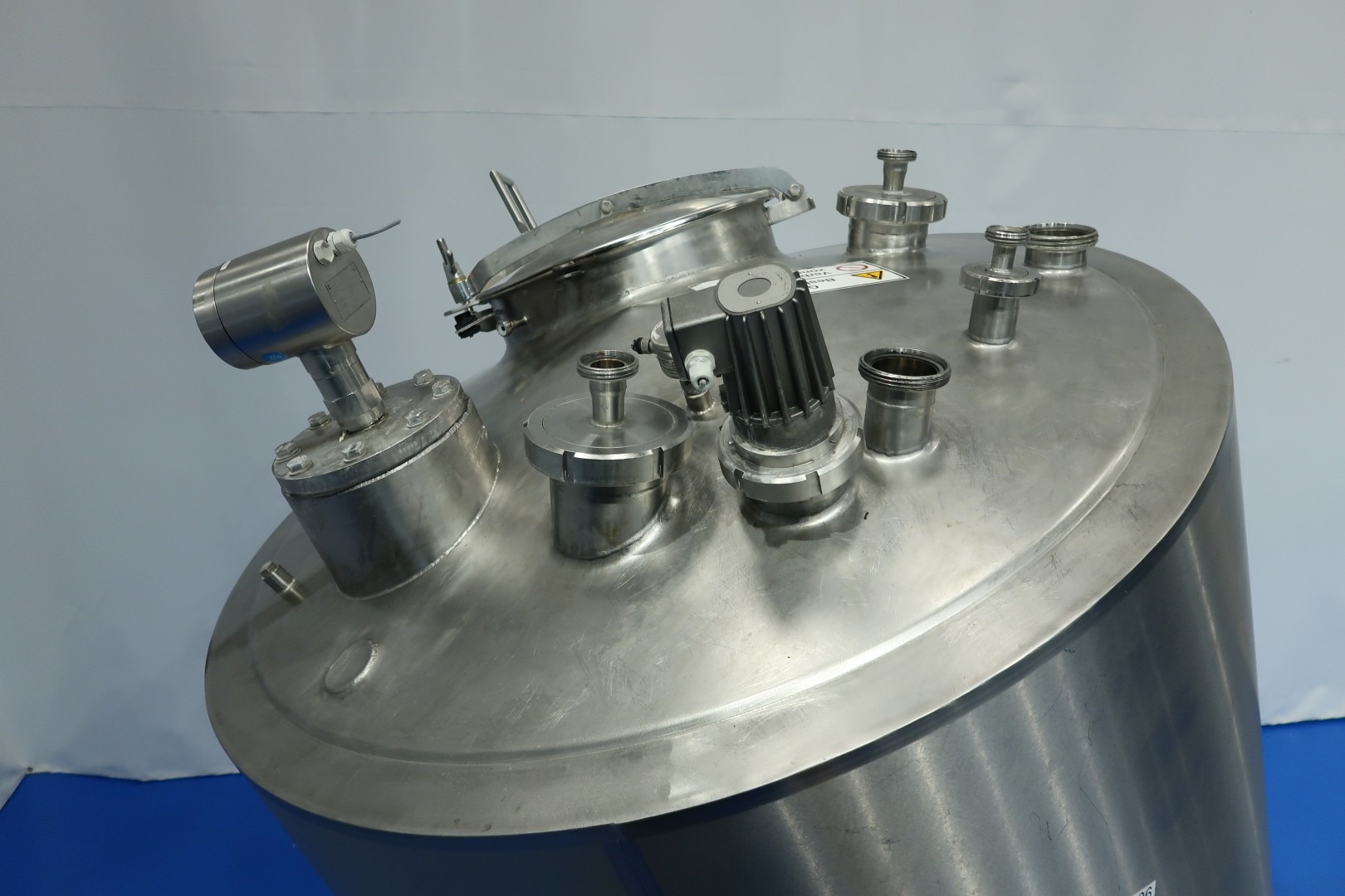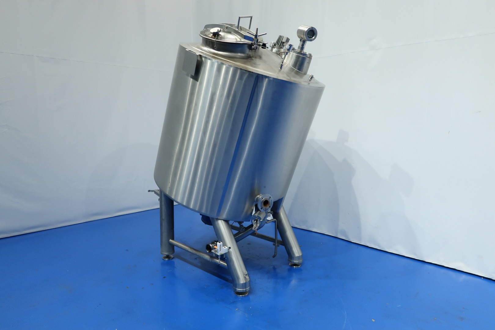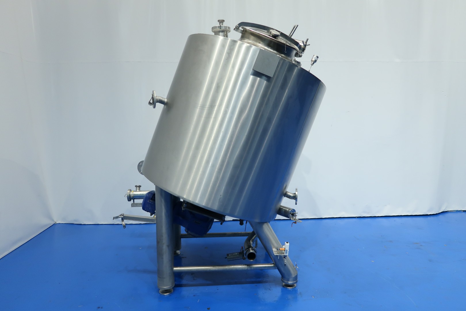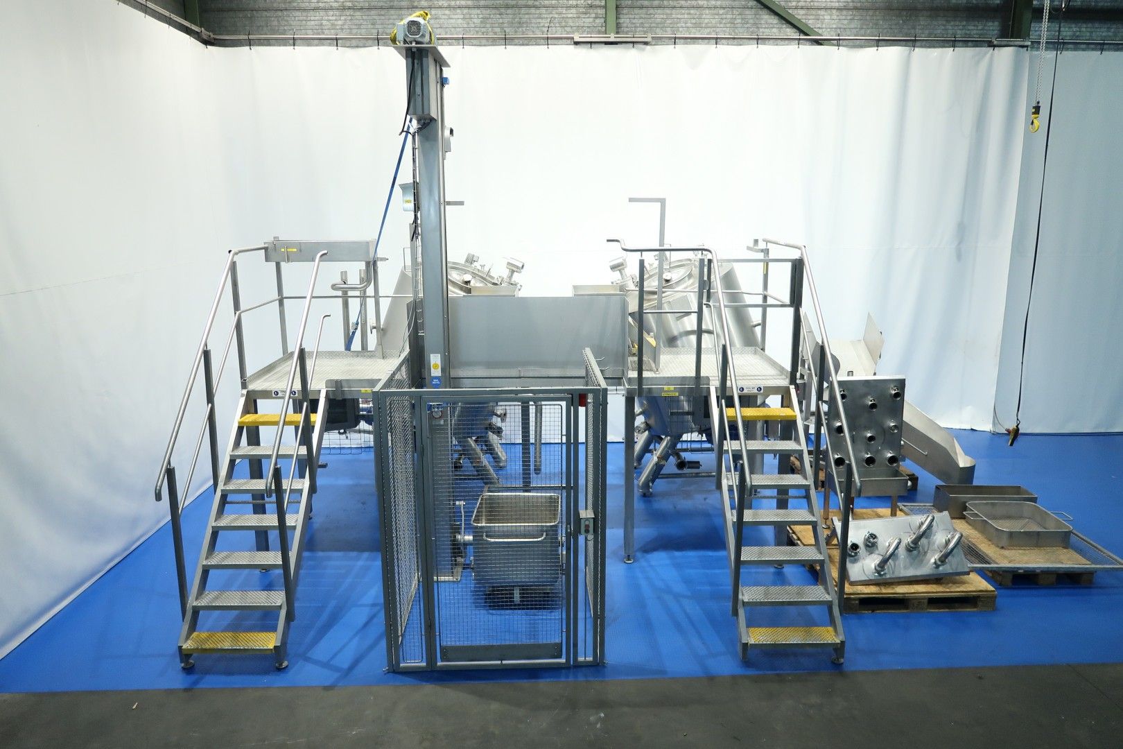Double jacketed process tank. Product capacity: 1.200 ltr. Bottom driven Scraper agitator. Motor power: 4,5 kW - 8,4 A - 23 rpm. Pressure in tank atmospherique. Jacket in 2 sections 1: 21 ltr. 2: 61 ltr. 4 bar - 150 °C. Insulated, side and bottom. Placed under an angle approx. 20°. Product outlet DN80 Din and outlet height: 35 cm. Including mix proof, pneumatic butterfly valve. With tempemperature sensor with display on the head and with high and low level sensor. 4 CIP spray bowls. Manhole in top, round, diameter 51 cm. 4 Adjustable feet. Inside dimensions of tank: Ø 135 cm and height 125 cm. Total dimensions: 160x140x260 (lxwxh) cm - weight: 900 kg. Also available with second Terlet proces tank (STN15974), SS frame with stairs, bin-trolley elevator (STN16009) with adjustable funnel for adding ingredients (standard trolley size) with safety fence around elevator. (last photo is a complete overview) .