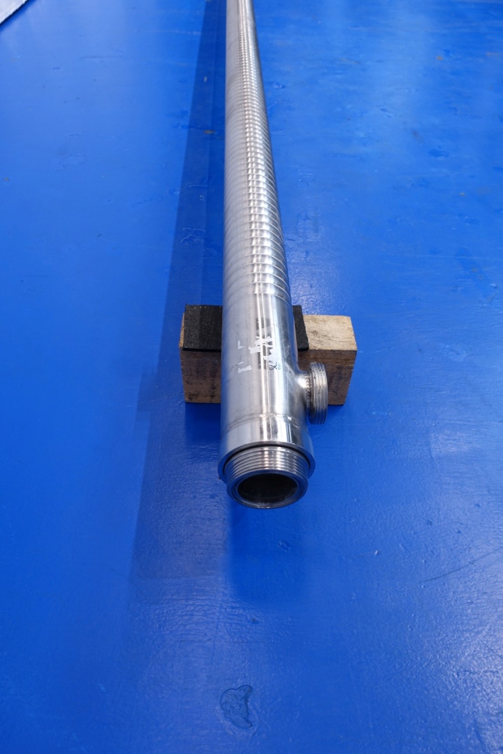 Tube heat exchanger, straight design multitube, length: 6mtr, 7 inner tubes with diameter 22 mm, outer tube coagurated. Outer tube diameter 113 mm. Capacity: 0,41 m2x7=2,9m2. With connections product in/out DN 80 SMS - jacket in/out 2,5" SMS. Total dimensions: 604x15x15 (lxwxh) - weight: 67 kg.