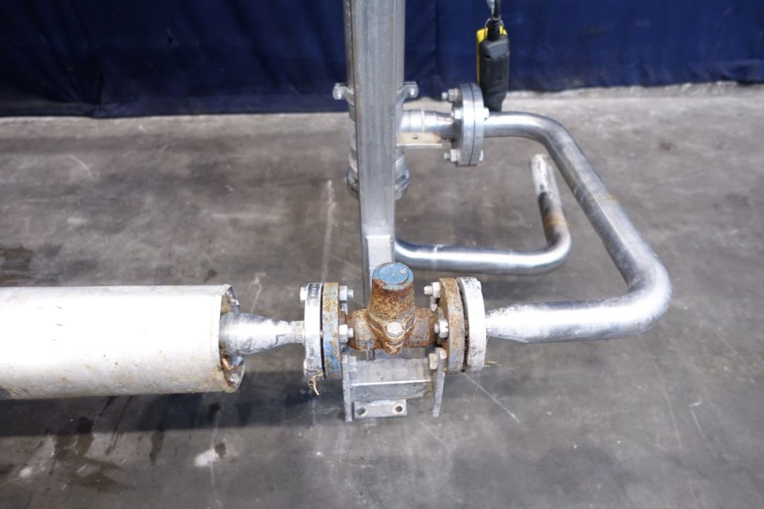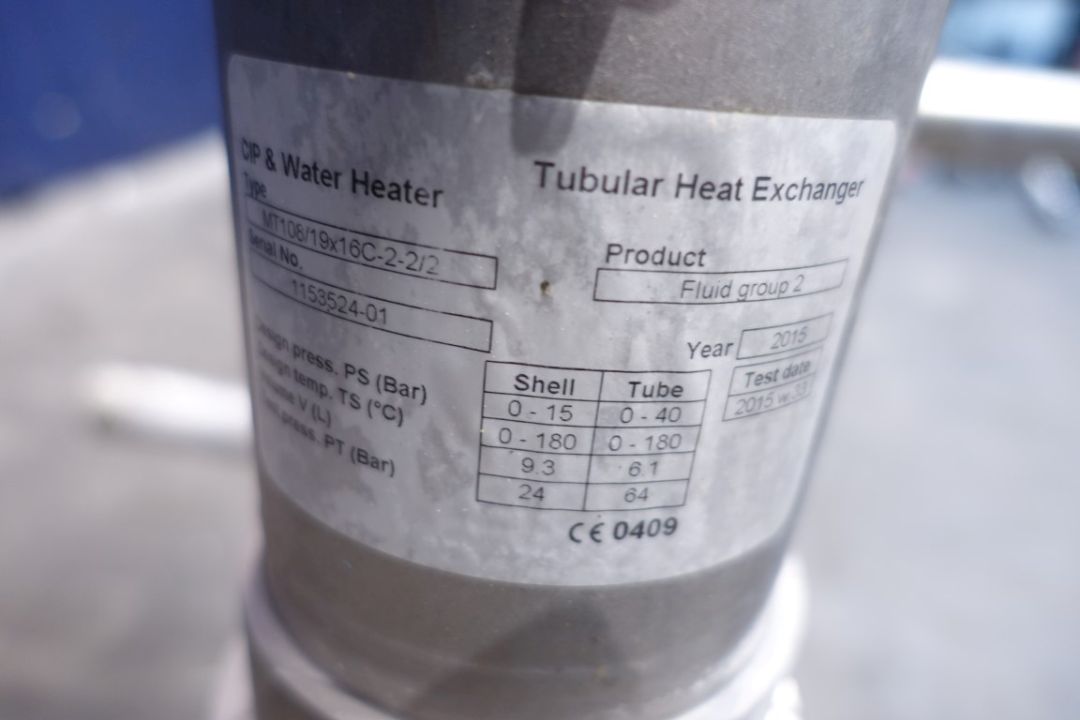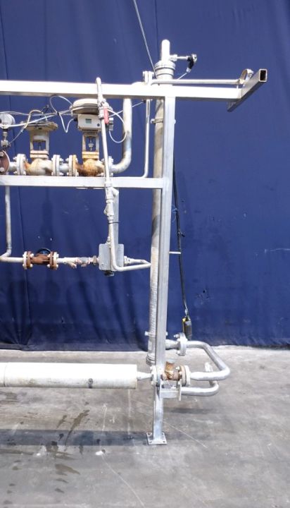 Hotwater set with tubular heat exchanger, steam valve (Samson) and piping. Pressure: shell 0-15 bar, tubes 0-40 bar. Temperature: shell 0-180 °C, tubes 0-180 °C. Volume: shell 9,3 liter, tubes 6,1 liter.