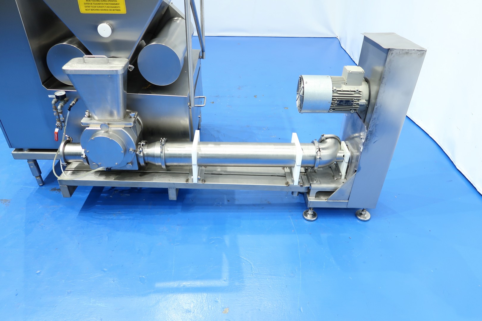 Ingredient doser / Fruit feeder, To add a dry ingredient to a liquid like icecream or butter (this machine). Main components of the unit: 1.) Dosing unit, 2.) Lamella transfer pump, 3.) Horizontal Mixer (used on butter) and 4.) Control panel. Hopper with 1 x SS auger to feed of ingredients to the lamella pump. Product to be dosed can be dry or liquid if it has sufficient viscosity to be retained by the augers. Liquid product capacity 200 - 4.000 liter per hour, dry product capacity 20 - 400 liter per hour. Hopper ± 70 L mounted on 3 weighing/load cells. With inline horizontal mixer. On SS frame with adjustable feet, parts for CIP cleaning. Connections: 2x DN100 Tri-clamp. With documentation (in French). No operation panel (was centralised). Total dimensions: 206x110x163 (lxwxh) cm - weight: 237 kg.