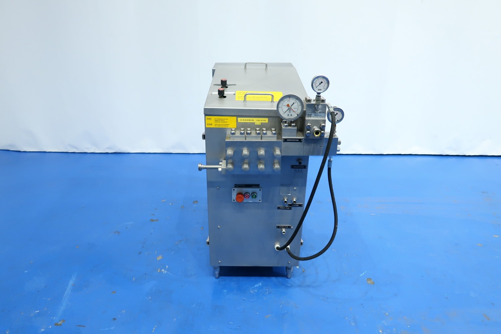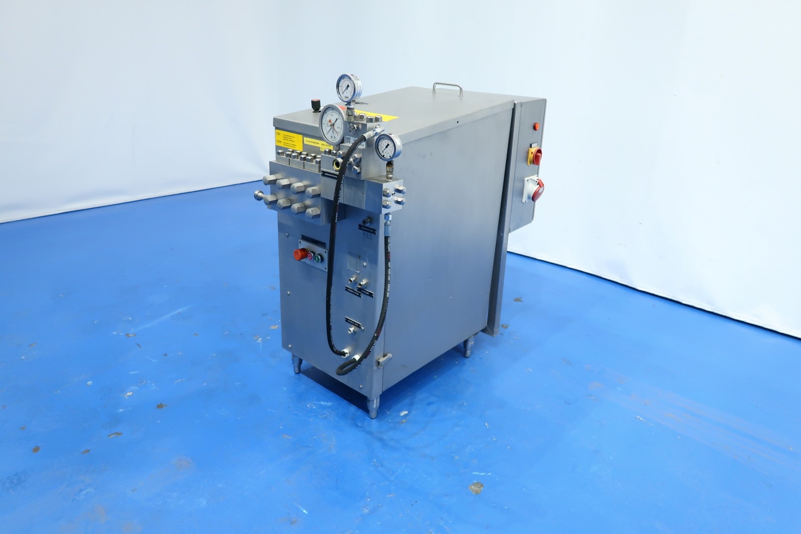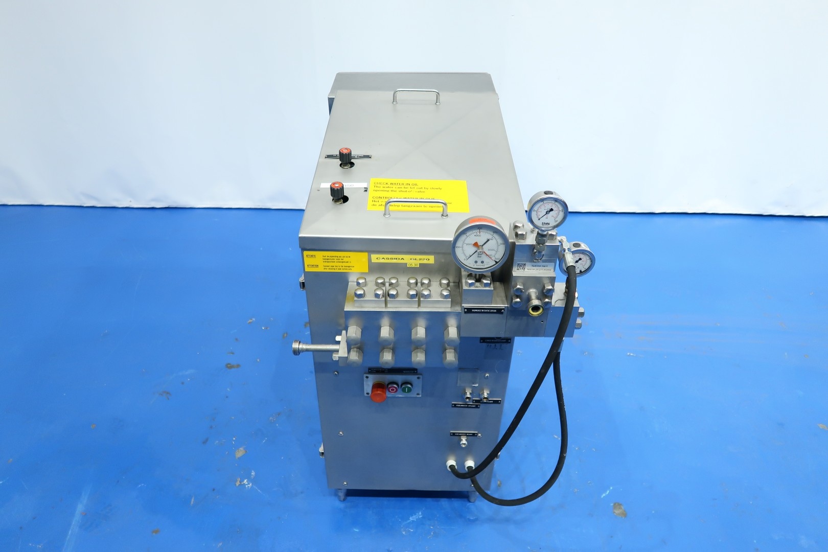 High pressure laboratorium homogeniser. 2 Stages with manual hydraulic pressure control, ball valves for viscose products, 3 Ceramic pistons, piston diameter: 14mm and stroke: 25mm. Stainless steel cladded. Motor power: 5,5 kW and maximum pressure up to 300 bar. Built in control panel. Manometer. Flowswitch on cooling water. Total dimensions: 107x56x105 (lxwxh) cm - weight: kg.
