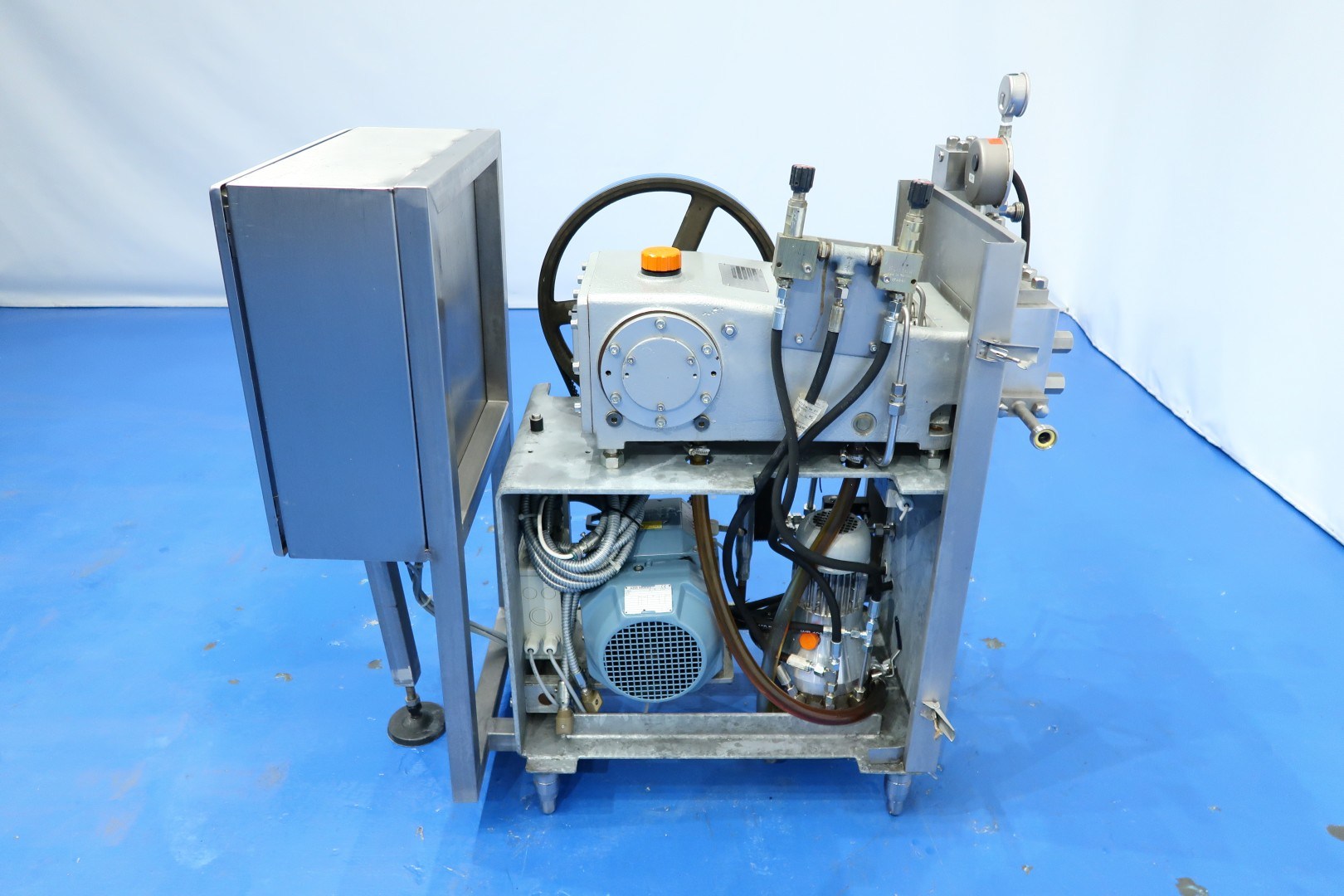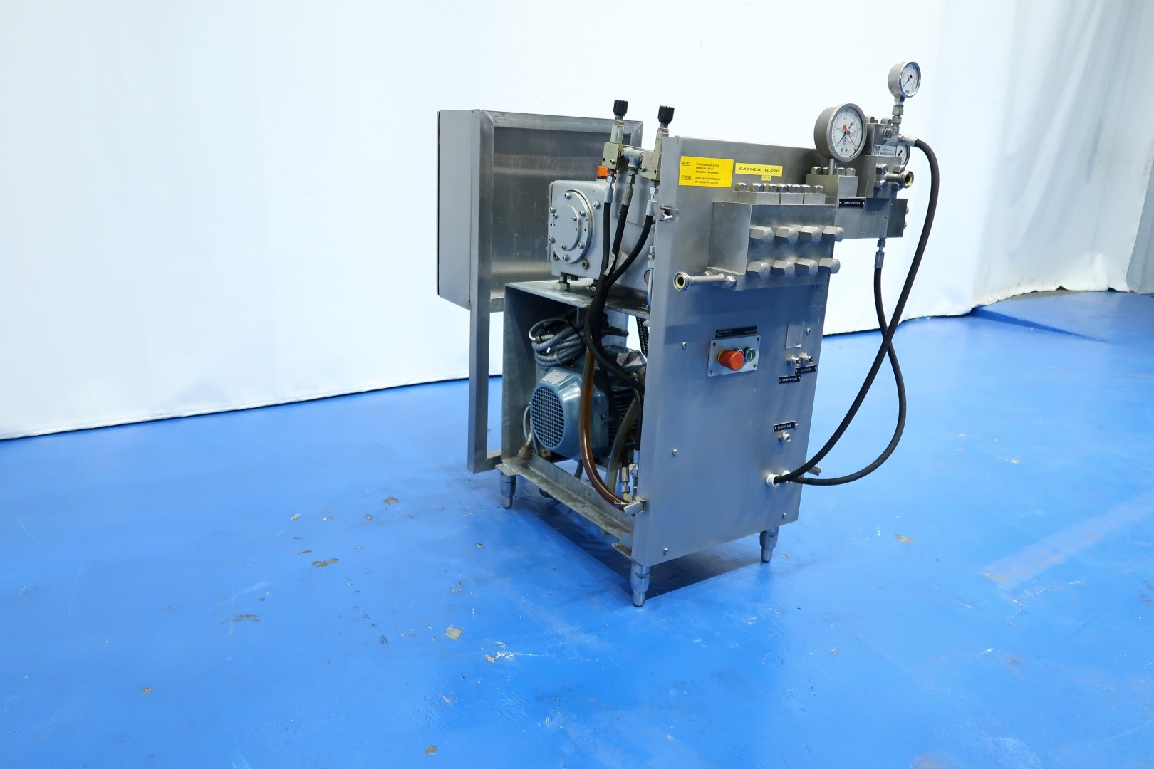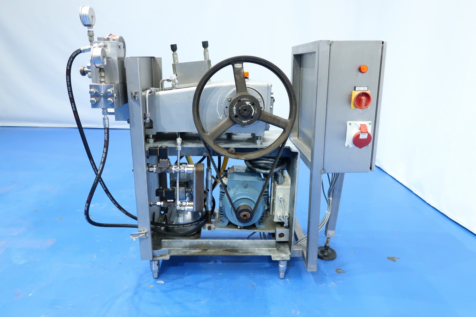 High pressure laboratorium homogeniser. 2 Stages with manual hydraulic pressure control, ball valves for viscose products, 3 Ceramic pistons, piston diameter: 14mm and stroke: 25mm. Stainless steel cladded. Motor power: 5,5 kW and maximum pressure up to 300 bar. Built in control panel. Manometer. Flowswitch on cooling water. Total dimensions: 107x56x105 (lxwxh) cm - weight: kg.