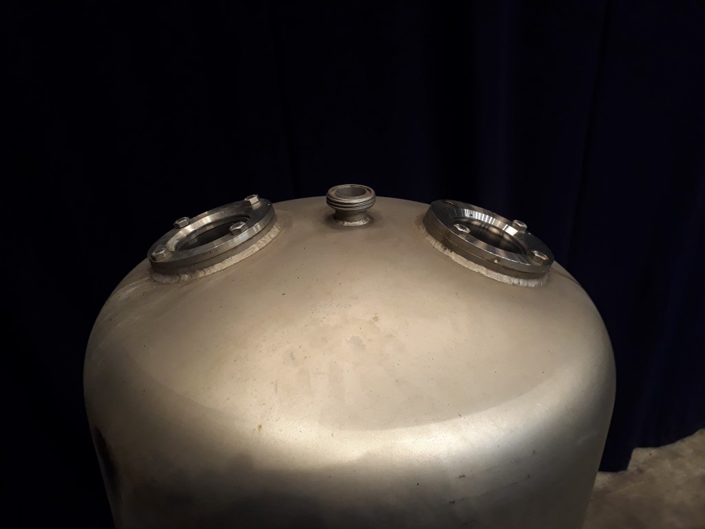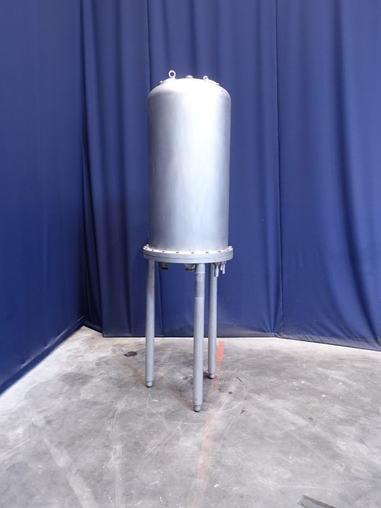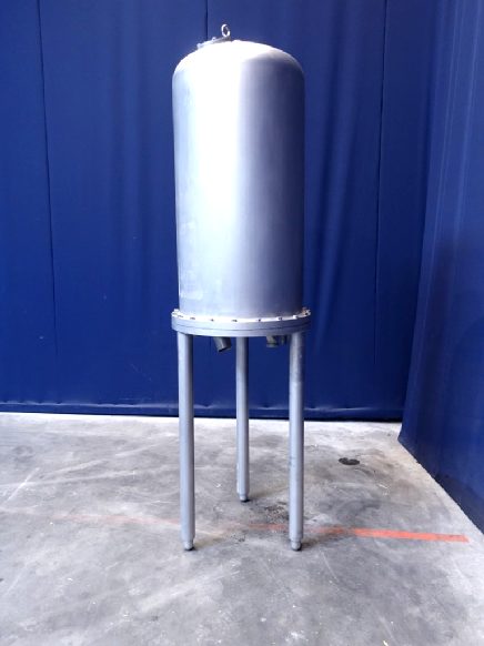Flash vat with condensor for UHT unit with direct heating system. In the flash vat the product is cooled by vacuum from sterlisation temperature of 135 / 150 °C to approx 80 °C by vacuum. Because of rapid cooling there is a minimum of thermal load on product. Total dimensions: 75 x 75 x 270 cm.