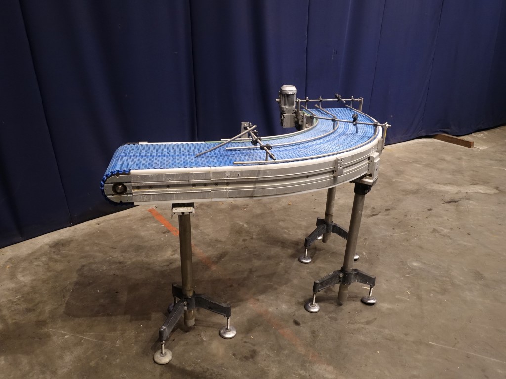 Chain conveyor. Effective Belt width: 38 x 210 cm. 90 ° corner. Motor: 0,25 kW - 0,73 A - n1: 1600 rpm - n2:82 rpm. Horizontal.