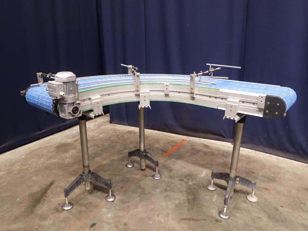 Chain conveyor. Effective Belt width: 38 x 210 cm. 90 ° corner. Motor: 0,25 kW - 0,73 A - n1: 1600 rpm - n2:82 rpm. Horizontal.