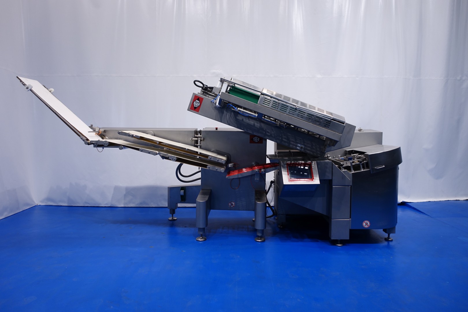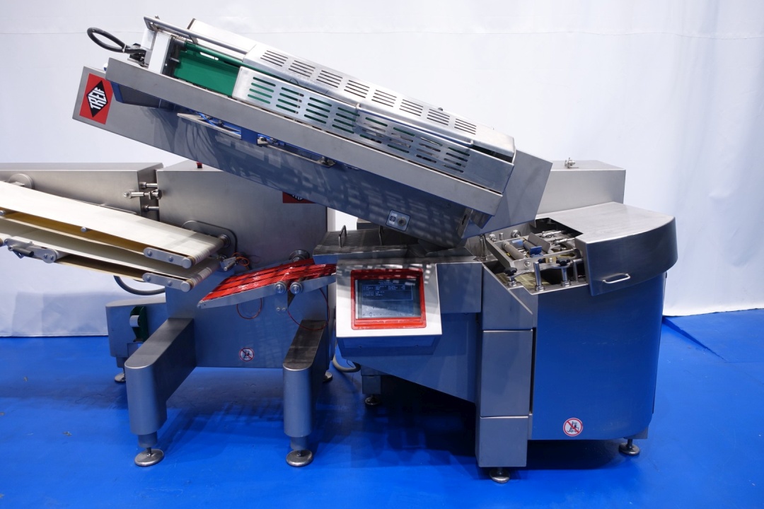 Cheese Slicer with automatic loading for all types of (semi) hard cheeses but also meat. The machine can be used in different ways stand alone or in production lines. Capacity up to 3200 cuts / min, slicing thickness range – 0.5 – 25 mm, chamber cross-section – 280 x 160 mm, length of the cut product (max.) – 1200 mm, height after unfolding – 2900, max. cut-off length (mm) 0.5–25, max. stacking height (mm) 100, touchscreen, up to 200 storable cutting programs, cutting statistics, automatic loading, rotatable loading chamber, infeed rollers for optimum guidance of long products. Sorting line with tray feeder for directly transporting products to the packaging machine. Total dimensions (2 parts): 530x180x215 (lxwxh) cm - total weight: 1.978 kg.