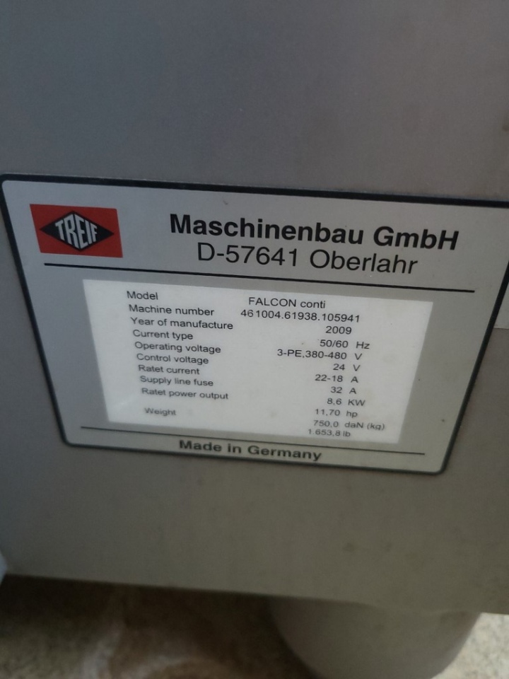 Fully automatic Portion Cutting machine. High-speed cheese or meat cutting / dicing / portion cutting / bread cutting machine by exact weight including checkweigher and sorting station with pusher. The portion is scanned and the machine automatically determines the length of the portion with high throughput. Based on nearly twenty years of experience in the area of cutting precisely weighed portions, TREIF developed the FALCON portion cutter. This Falcon has a digital display with touchscreen. Insertion cross section 260x155 mm / 220x155 mm, single length max. 1000 mm, application down to -4 °C. Power: 22A. Weight: 750kg.
