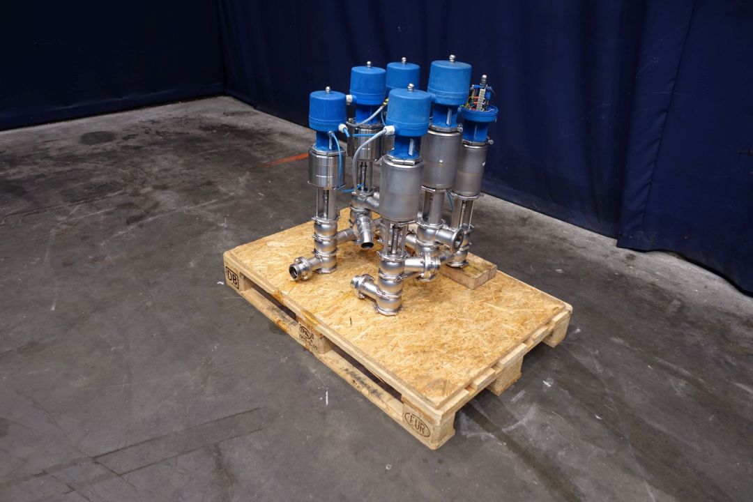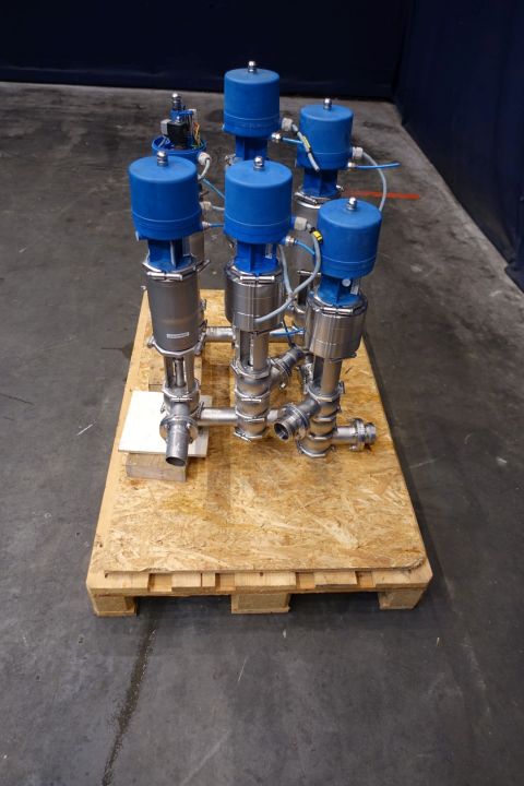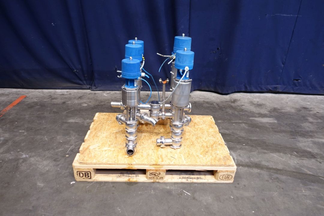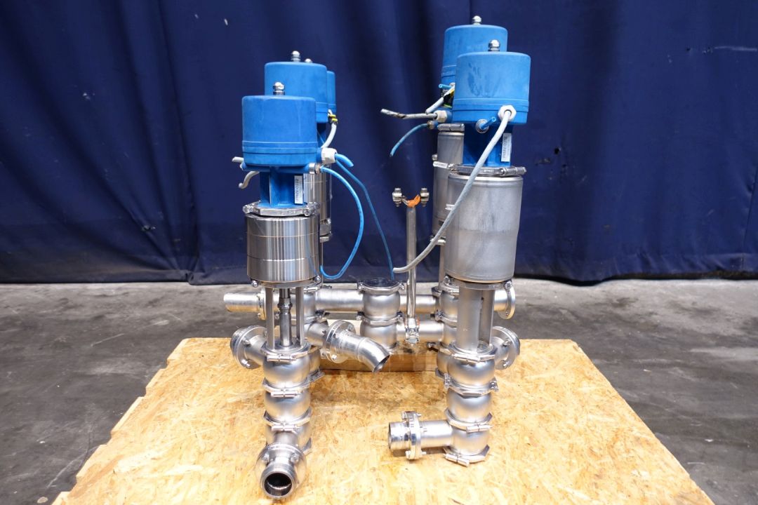 Valve manivolfd with 6 valves. Each with 3 way valves, varivent connections, single seat. Pneumatic activated. Connections: 3 x 2" SMS - 3 x pipe 2" and 1 x 2" flange. Dimensions: 69 x 60 x 85 cm. Weigth: 125 kg.