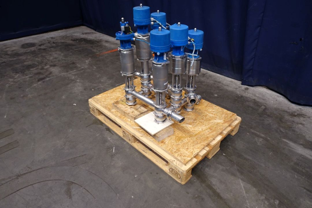Valve manivolfd with 6 valves. Each with 3 way valves, varivent connections, single seat. Pneumatic activated. Connections: 3 x 2" SMS - 3 x pipe 2" and 1 x 2" flange. Dimensions: 69 x 60 x 85 cm. Weigth: 125 kg.