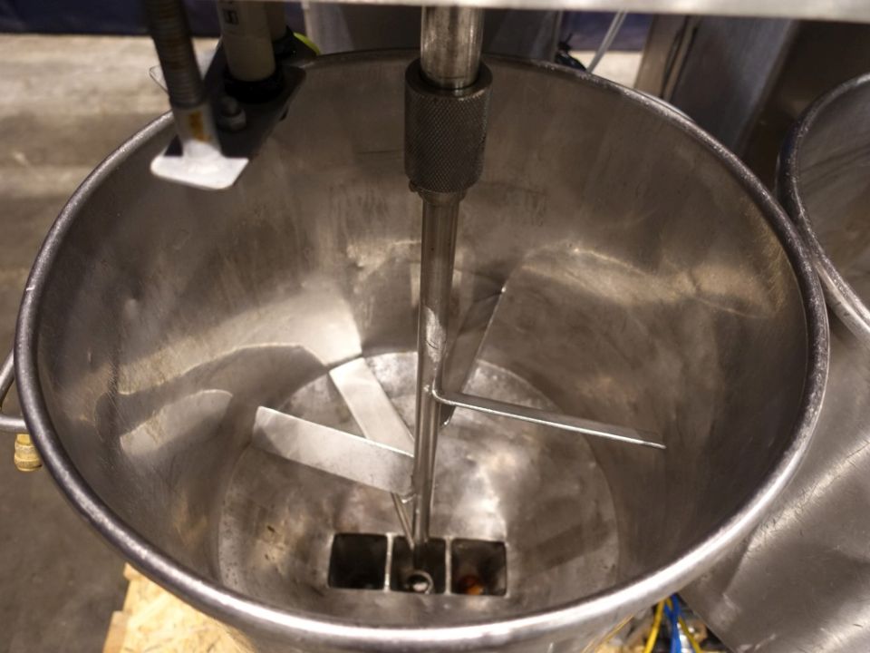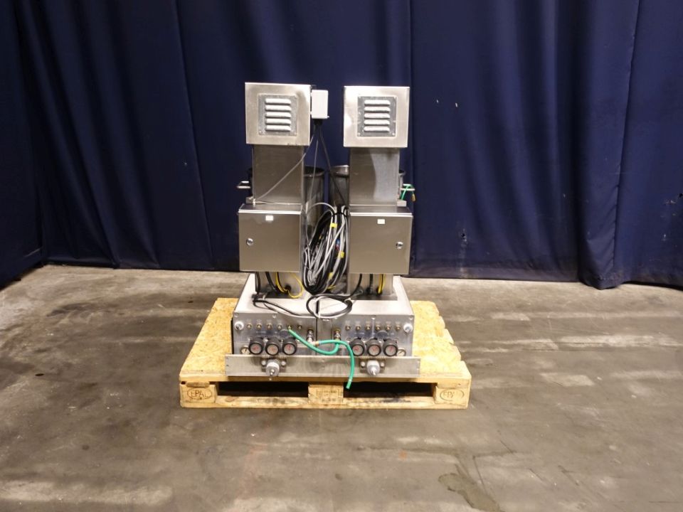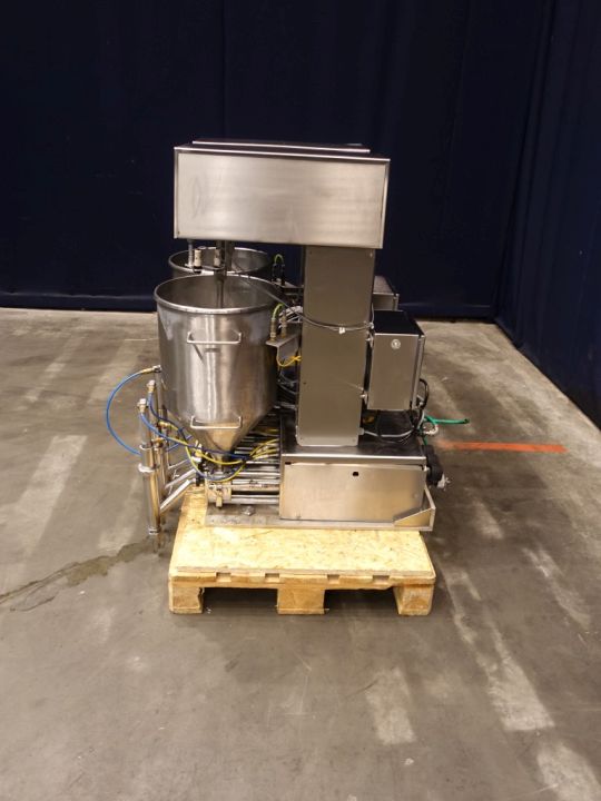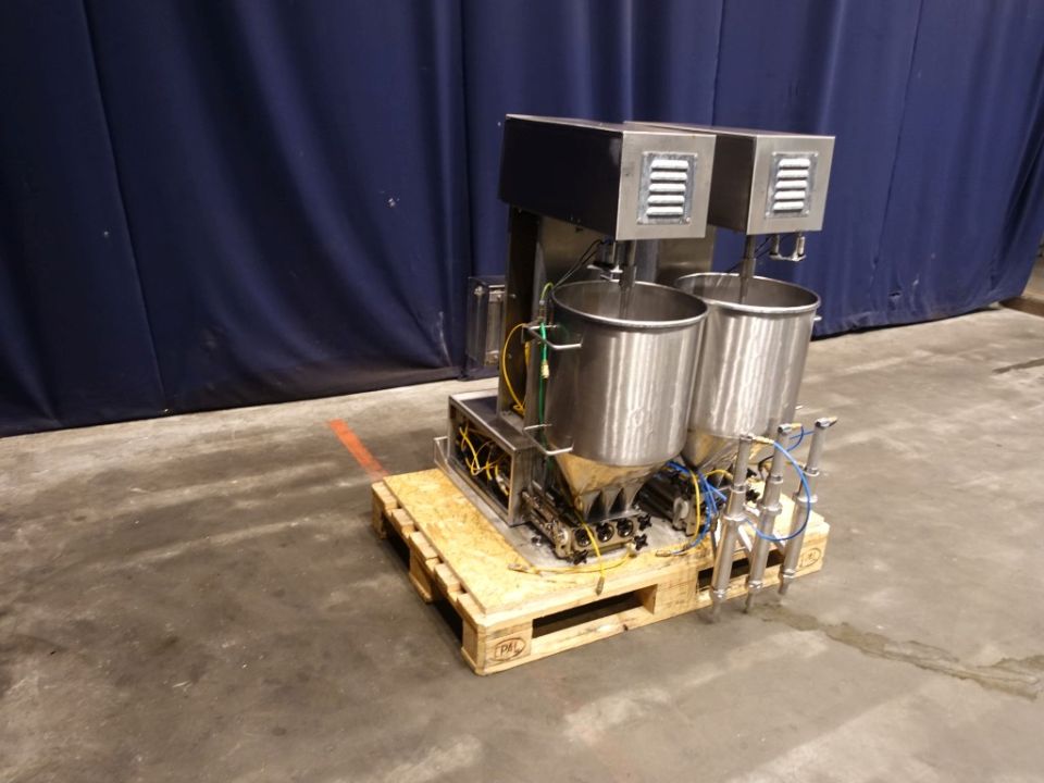 Dosing machine with two hoppers of 50 ltr each. Each hopper has an agitator and 3 filling heads. Adjustable are: deposit speed, suction speed and weight control. Volume product cylinder: diameter 55 mm, stroke 90 mm, volume max 215 ml/stroke. Diameter deep fill outlet: 25 mm.