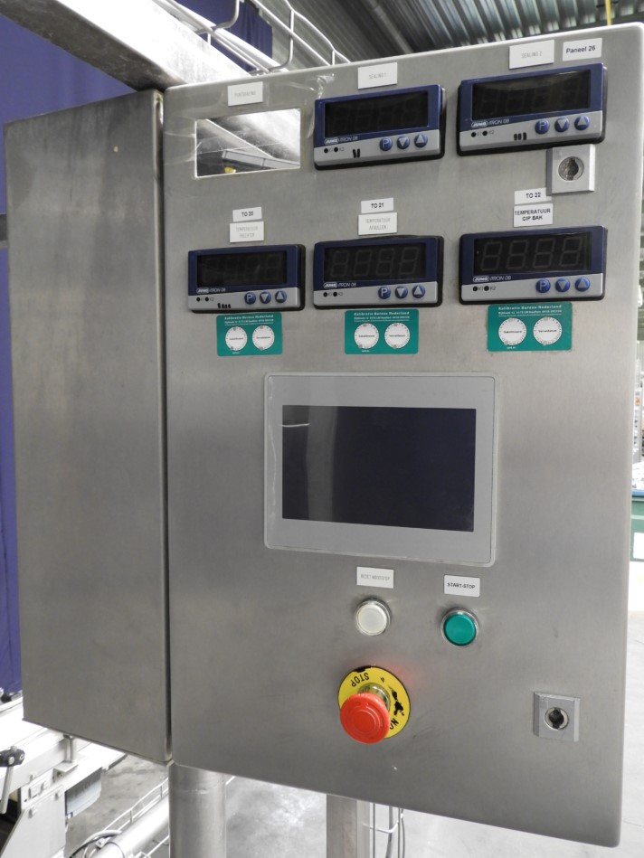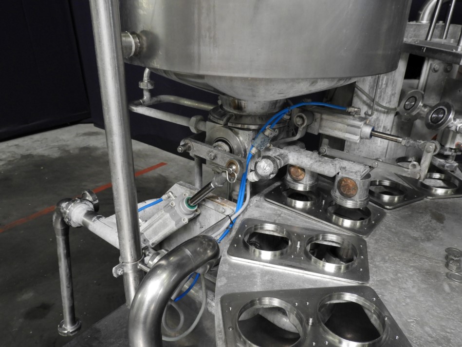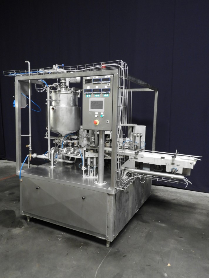 Rotatry cup filler with 2 heads. Cup size round 95 mm and oval ±120 x 65 mm. Stations: cup destacking, main piston doser (100-250 ml) used for used for processed cheese (hot fill) with double jacketed hopper and agitator in hopper (CIP cleanable), alu foil dispending by vacuum (pre formed), tip sealing, heat sealing, snap-on lid, after pusher and outfeed conveyor of ± 2 meter. Machine has stainless steel frame around the machine (excluding plexiglas safety guards. Easy format change. Controls: Omron PLC and Exor touch screen HMI. Electric scheme available. Total dimensions of machine: 300 x 200 x 235cm.