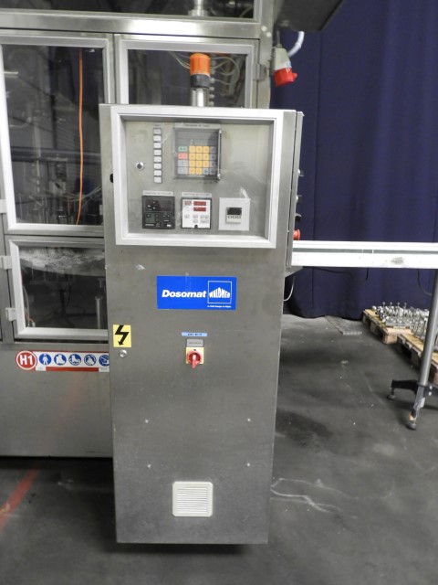 Rotatry filler with 8 Heads. 3 Formats: cup size round: 68 mm and 71 mm and 'duocup' 2x 70 mm. Stations: cup destacking, no cup detection by photocell, main piston doser (100 - 250 ml) with cup lift and hopper (CIP cleanable), seal dispending by vacuum, heat sealing, date coder by embossing ink, outfeed conveyor. Machine has plexiglas safety guards. Machine is in clean configuration with a hepa sterile air system. Easy format change (turn table in 4 parts). Controls: Siemens, model: S5 and cam corder HMI. Documentation available. Total outer dimensions lxwxh: 350 x 250 x 320 cm.