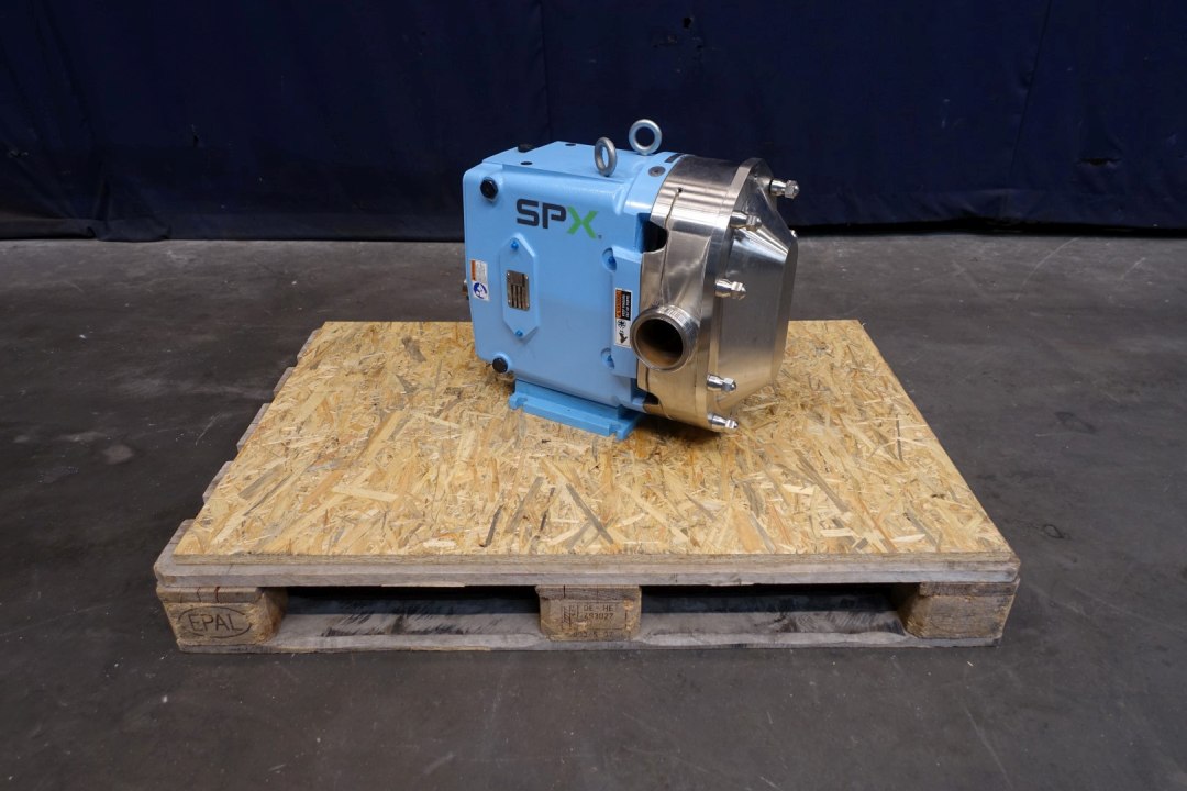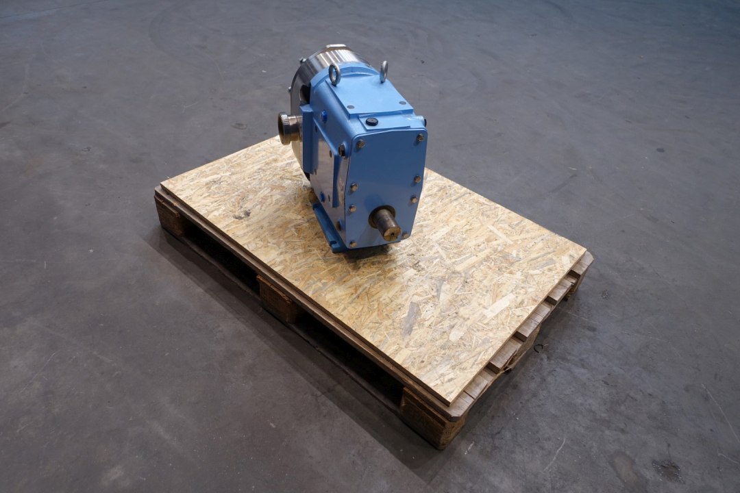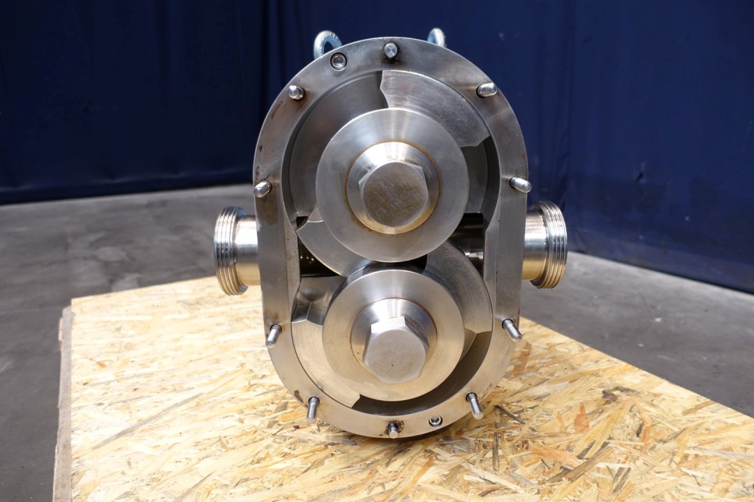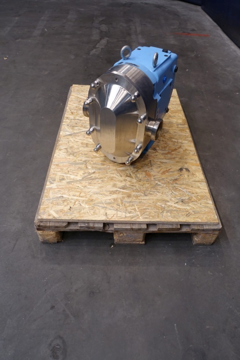 Lobbe pump with duo stainless steel lobbes (twin wing). Diameter lobbes: 215 mm. Displacement per revolution: 1,438 ltr. Nominal capacity 52,5 m3/h. Design pressure up to 31 bar. Flushed seal. Connections: (in) 3'' / (out) 3'' SMS. Currently without drivework. Dimensions: 60x36x49 (lxwxh) cm, weight: 261 kg's.