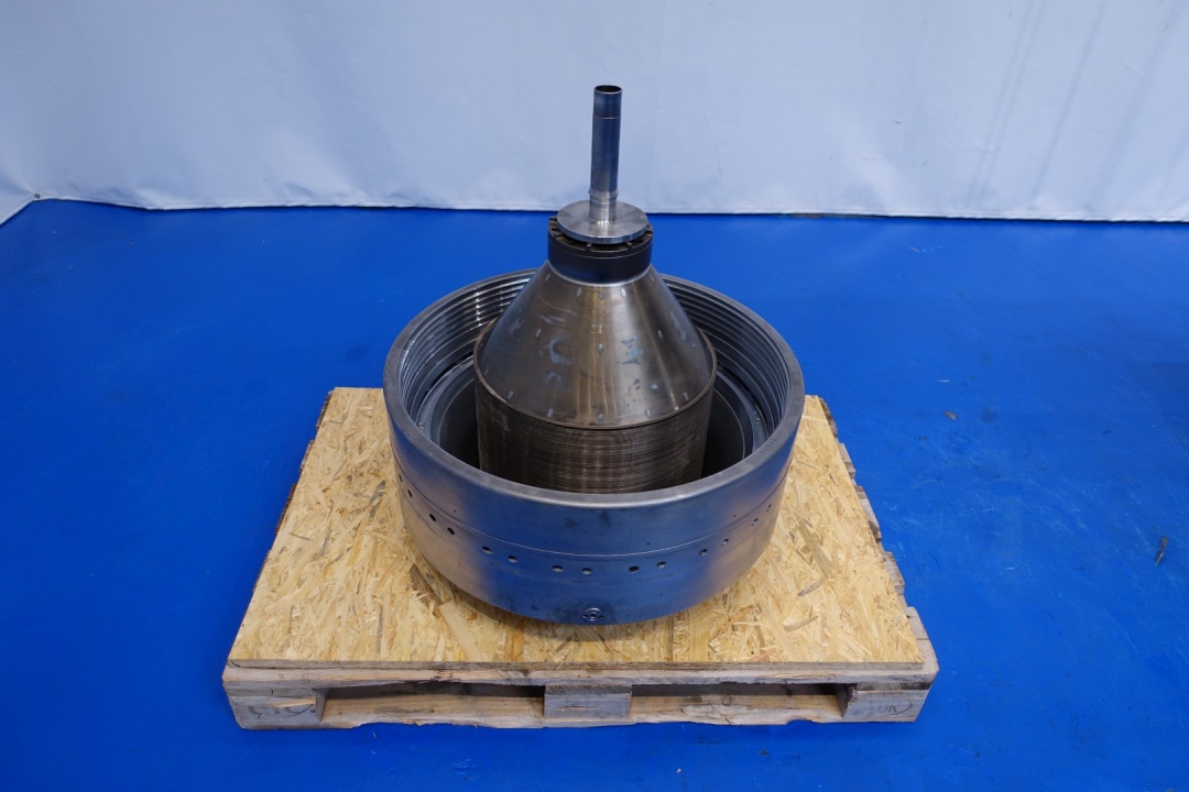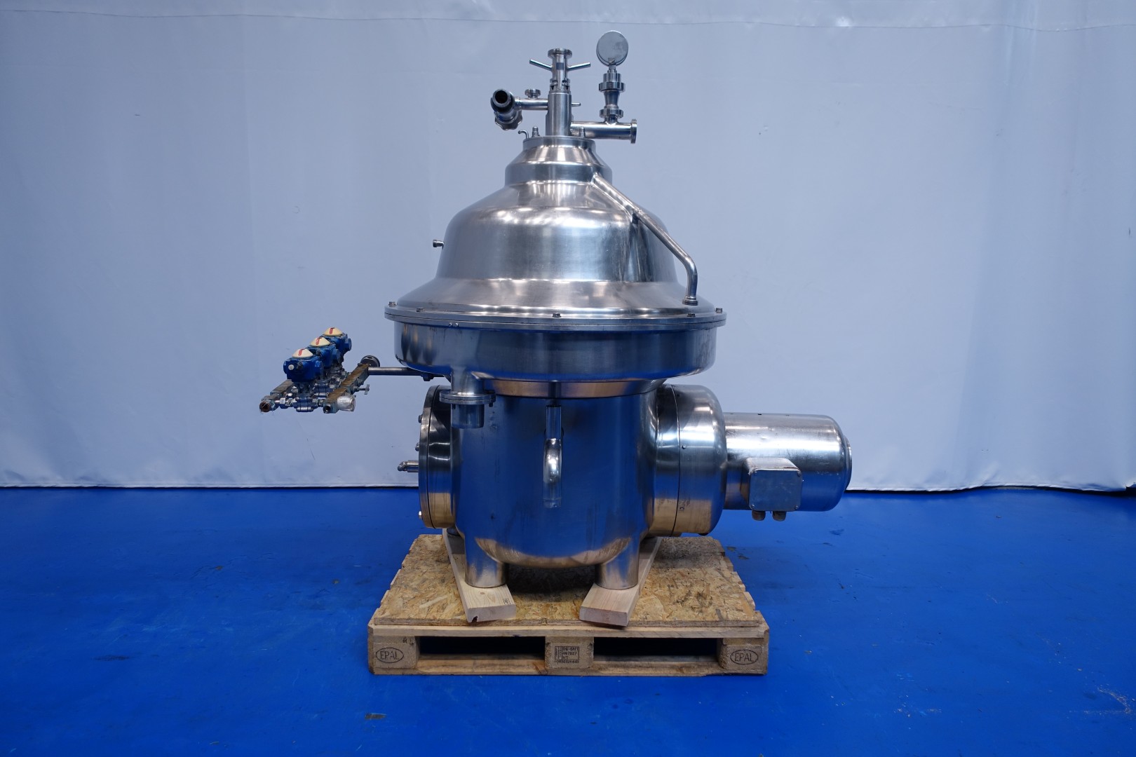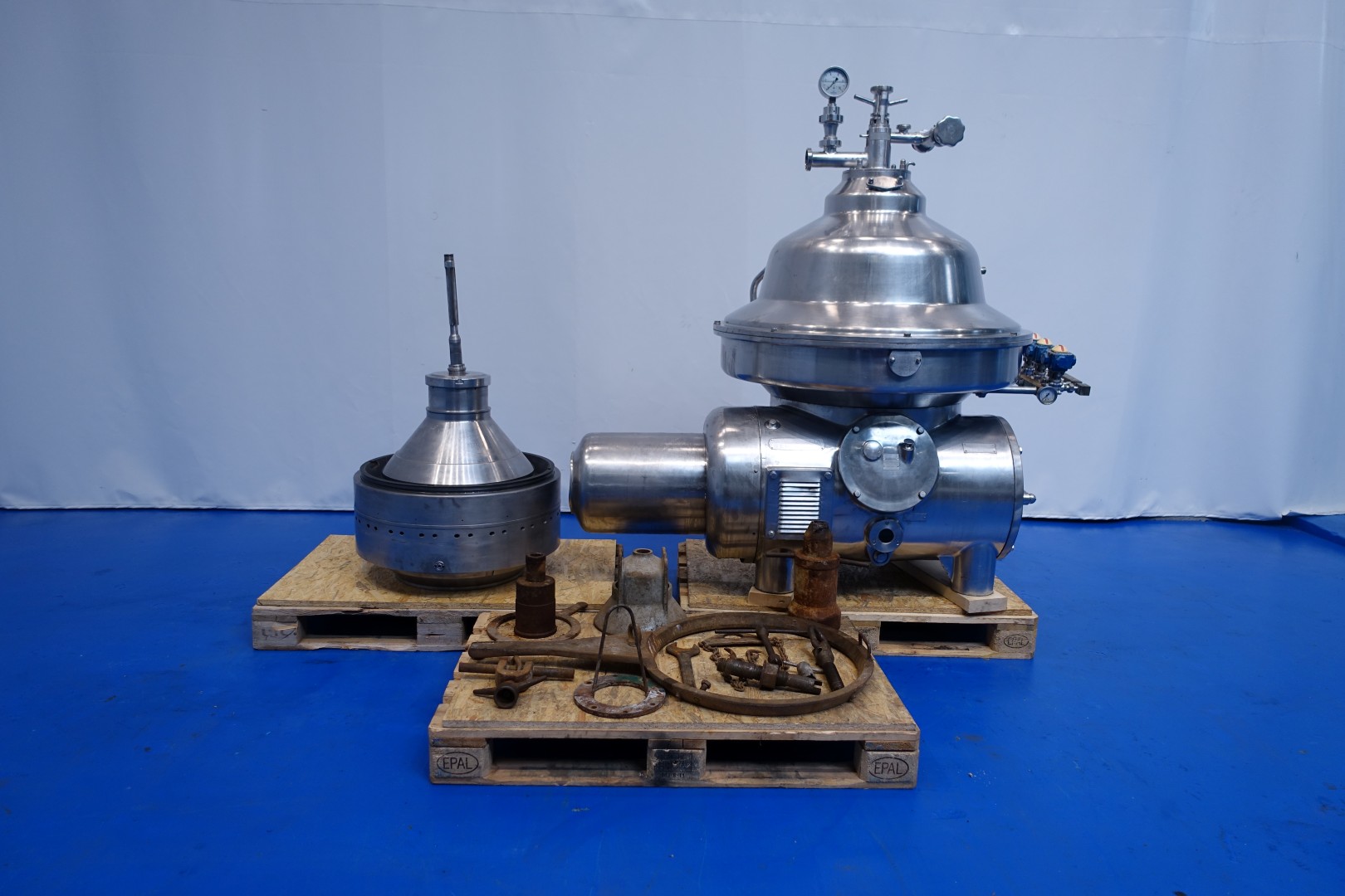Milk/cream separator (skimmer), self cleaning. Bowl speed 4.500 rpm. Including bowl, motor cover, pressure meter on outlet and counter pressure valve, manual flow regulation valve for cream and manouvering water valves. Motor 18,5 kW . Liquid clutch. Set of tools with ring key (incomplete). Total dimensions: 185x95x195 (lxwxh) cm - total weight: 2.079 kg.
