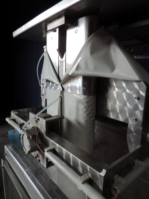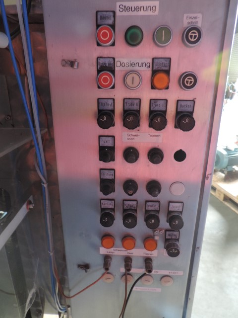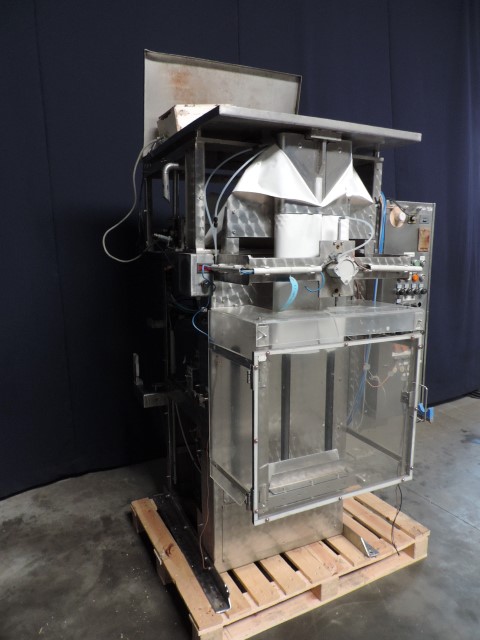 Vertical transwrap form fill seal machine. Sholder size 330 x 65 mm, length adjustable. For 5 and 10 ltr plastic bags, from a roll by heatsealing. Pneumatic driven, For thin liquid products like milk or water. Time filler. CIP cleanable.